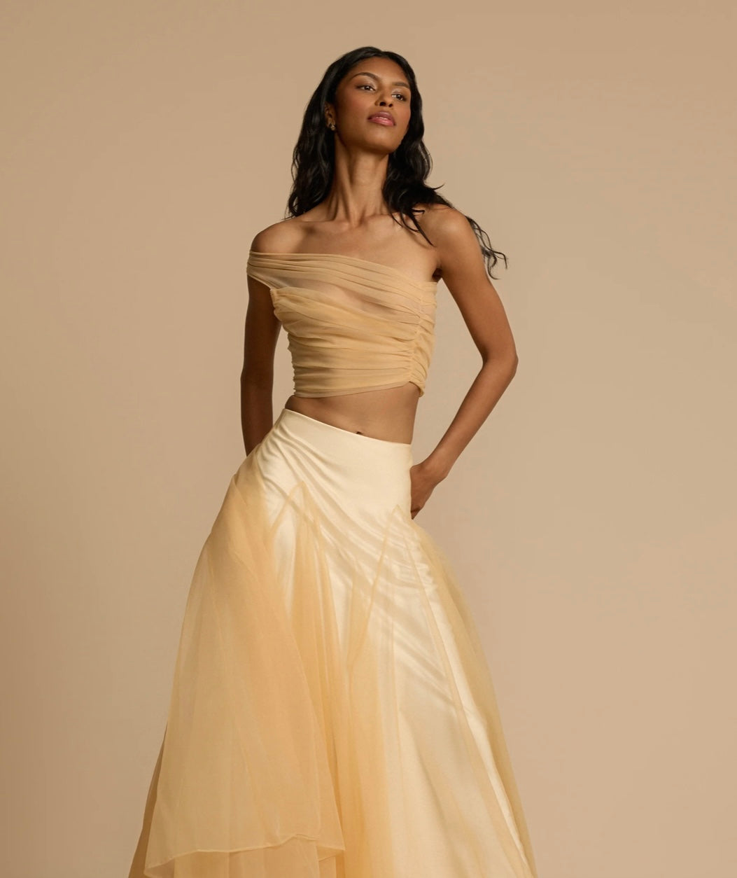 Elevate your look with our Violetta top, crafted with soft bridal tulle featuring a semi-sheer finish for a touch of sensual elegance. Made to drape over your bust and effortlessly sit off the shoulder to highlight your décolletage. Violetta features a hand tacked ruching technique that finishes at the waist. Paired perfectly with our Violetta Skirt for an elevated ensemble, or pulled back with your favourite denim. Offering styling versatility, the Violetta Top is a timelessness must have.
