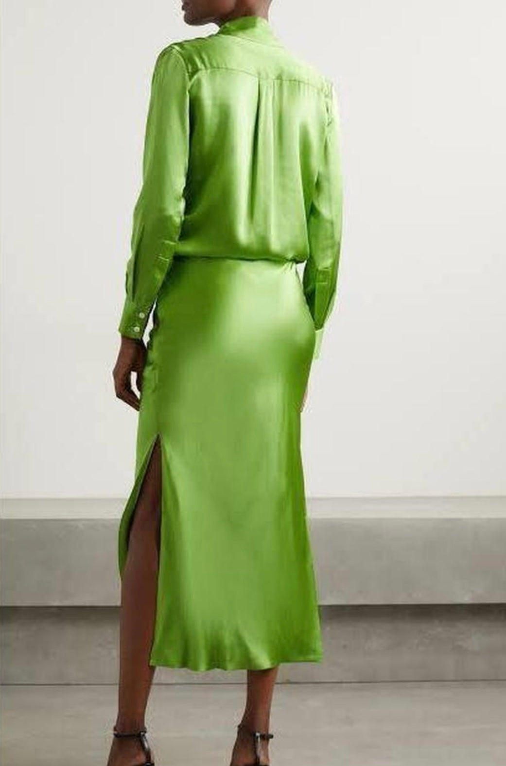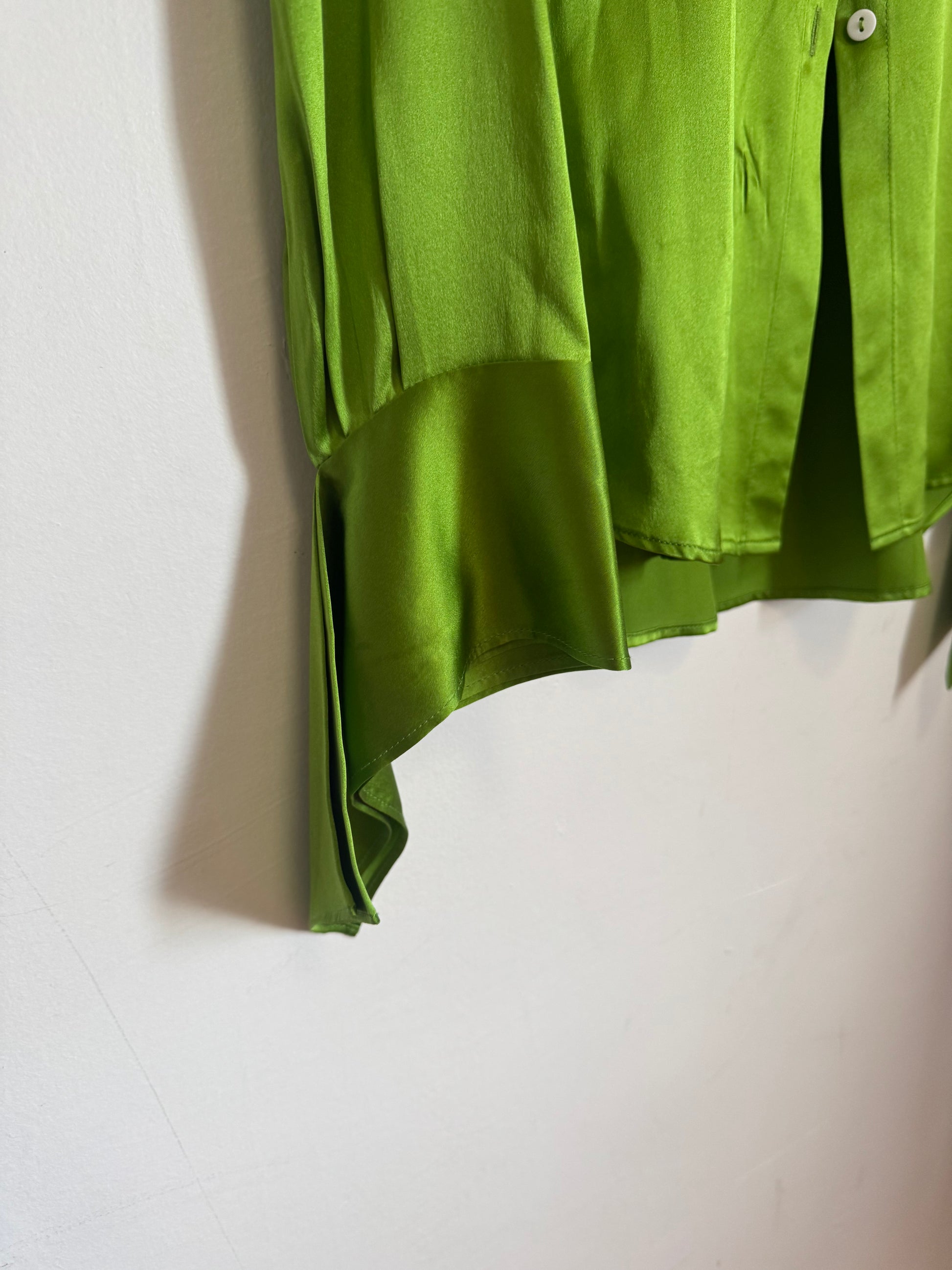 Collared neckline. Long sleeves. Bias cut. Contrasting white button at center front closure. Flared cuffs. Satin feel. 100% silk