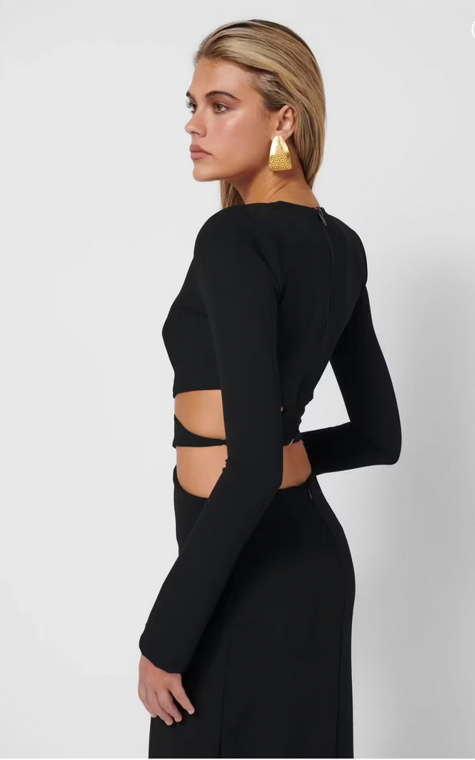 The Demmler gown is cut from figure-hugging stretch crepe fabric. This long gown / maxi has diamond-shaped cut-outs on the front and a deep v neckline.