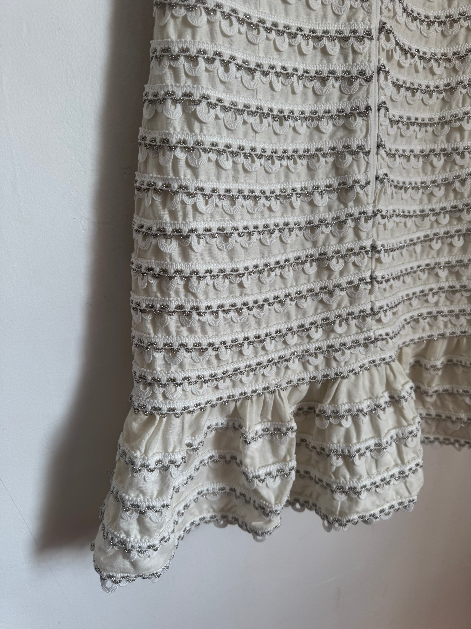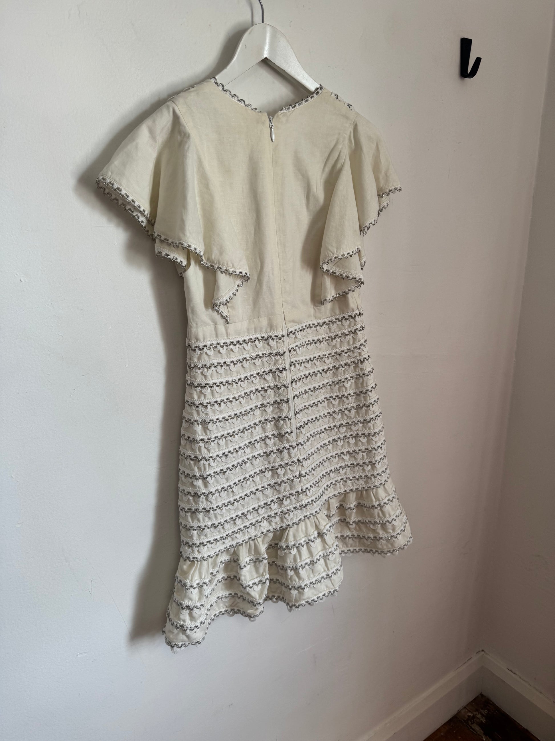From champagne to cocktails, your new go to mini. This mini dress features a deep V neckline with front tie detail, circle cut frilled sleeves, fitted skirt finished with frill and bead and scallop trim combination.