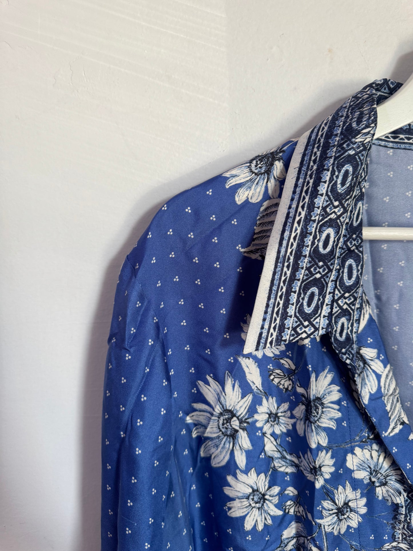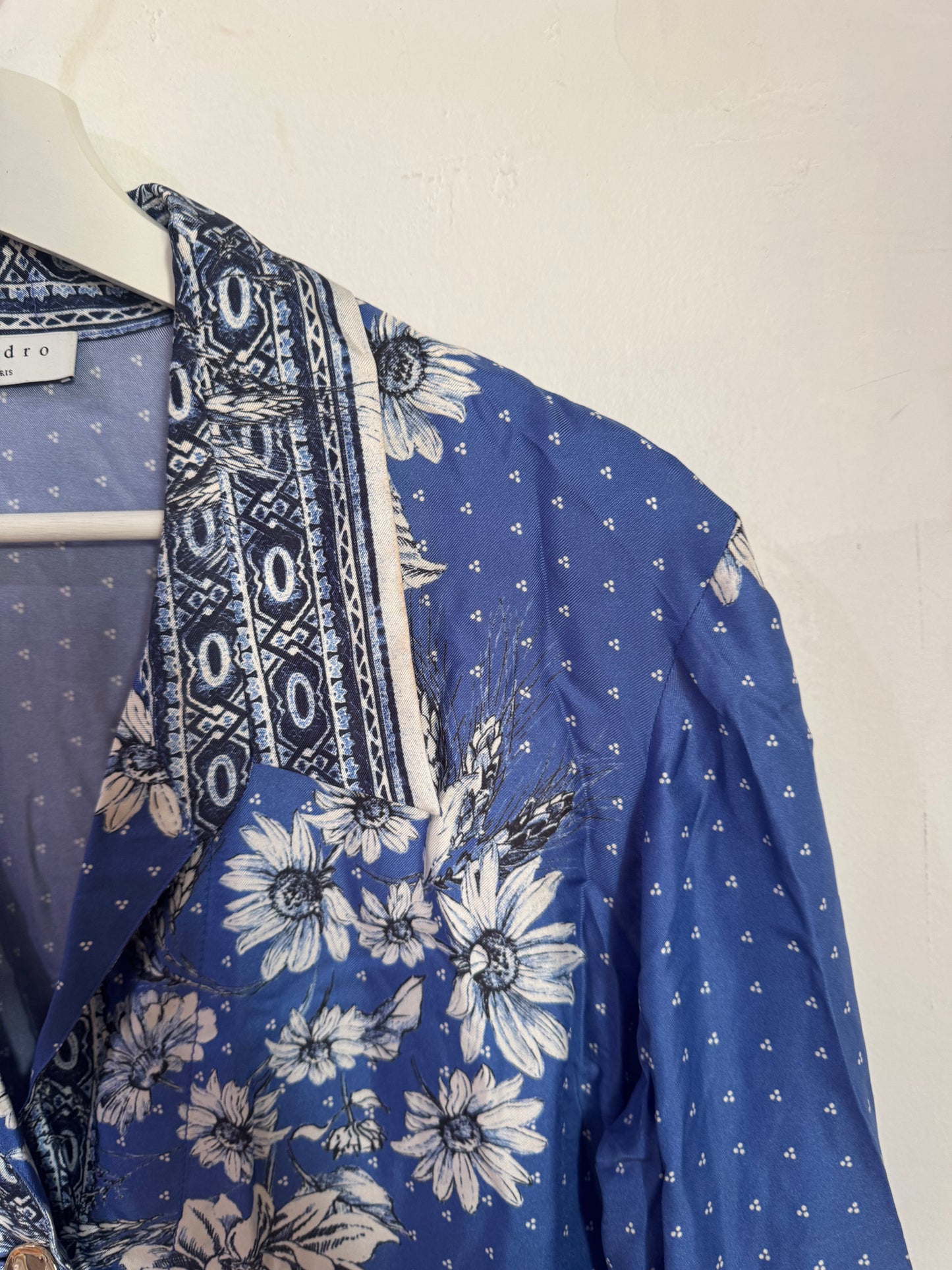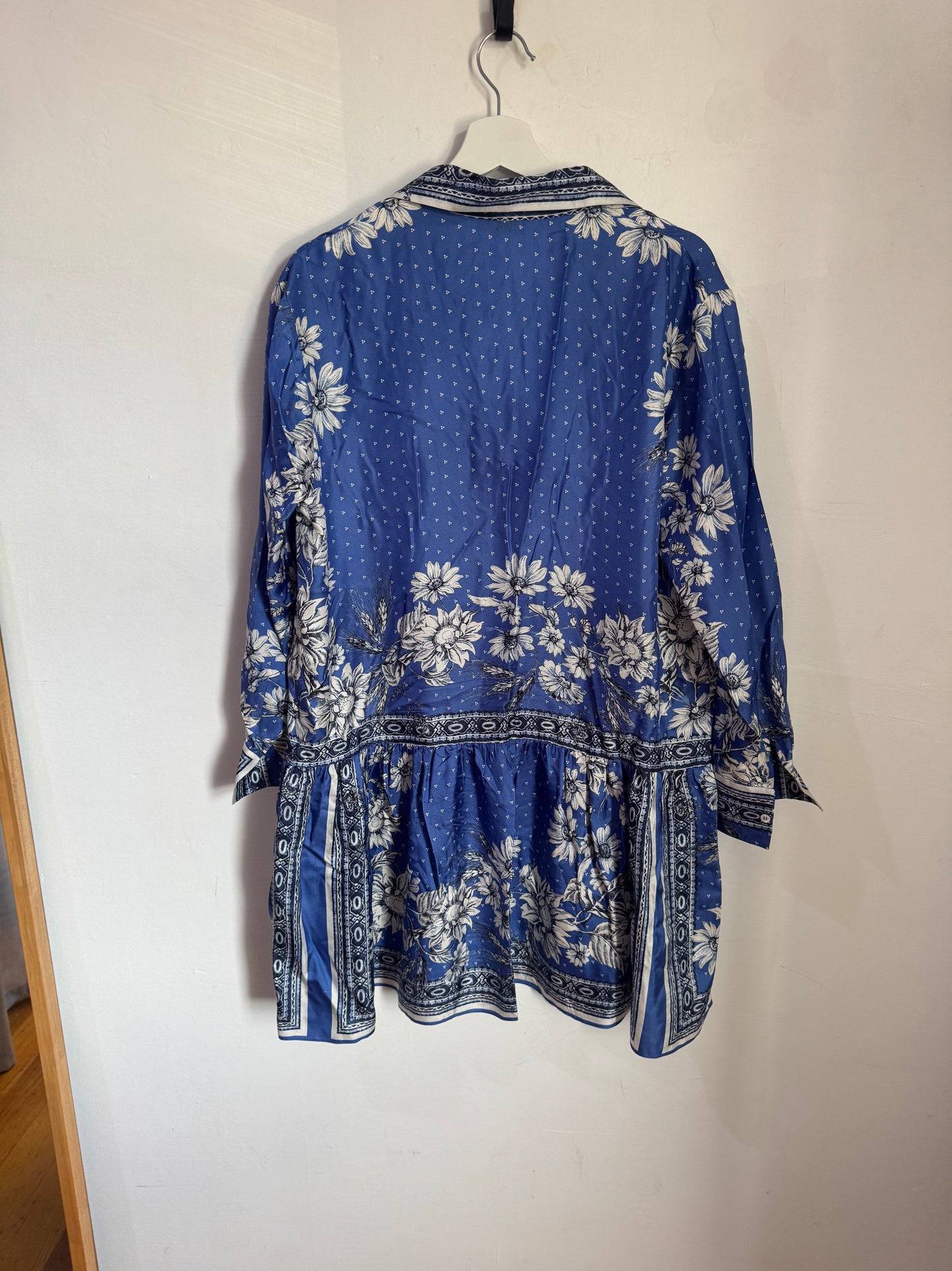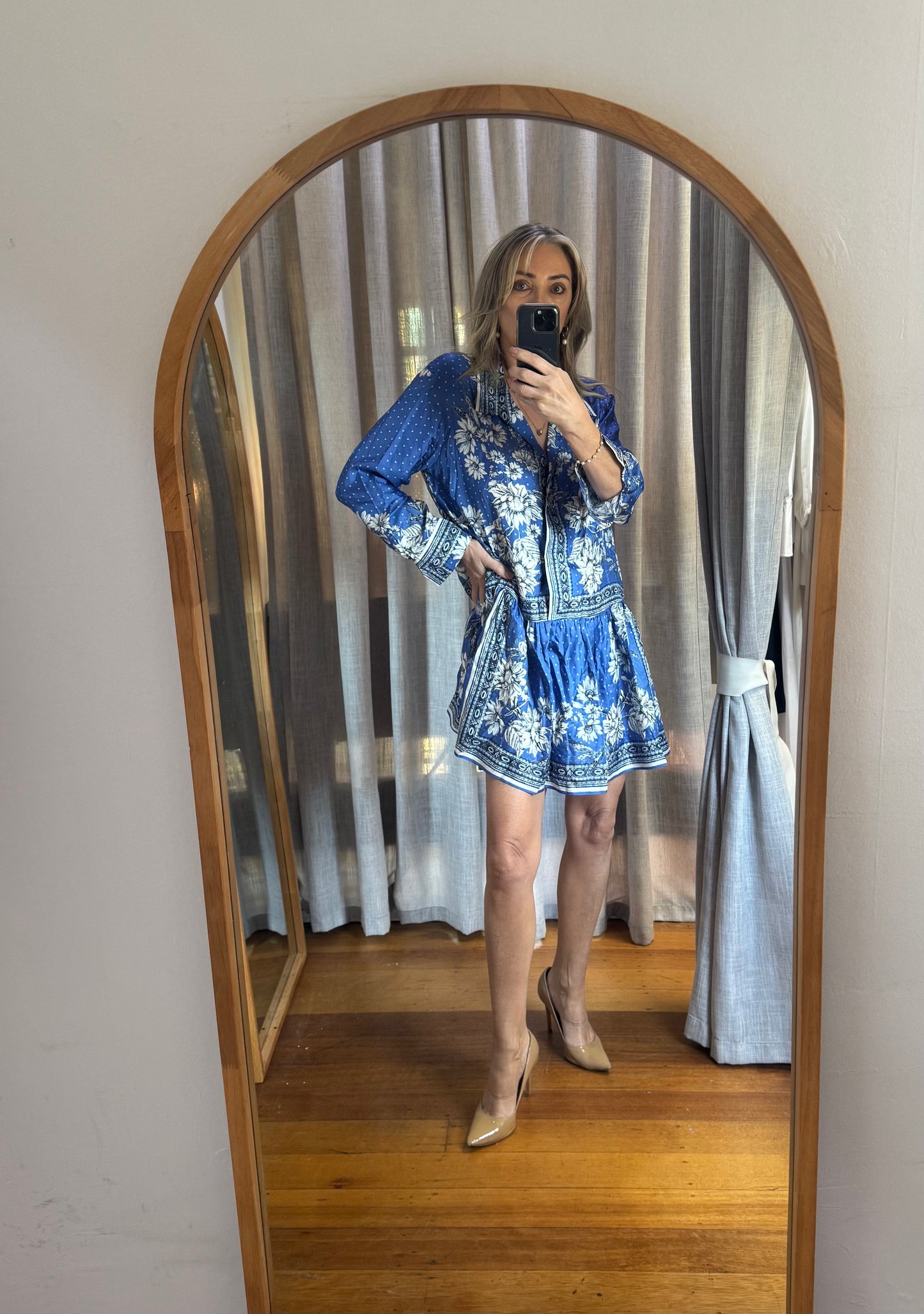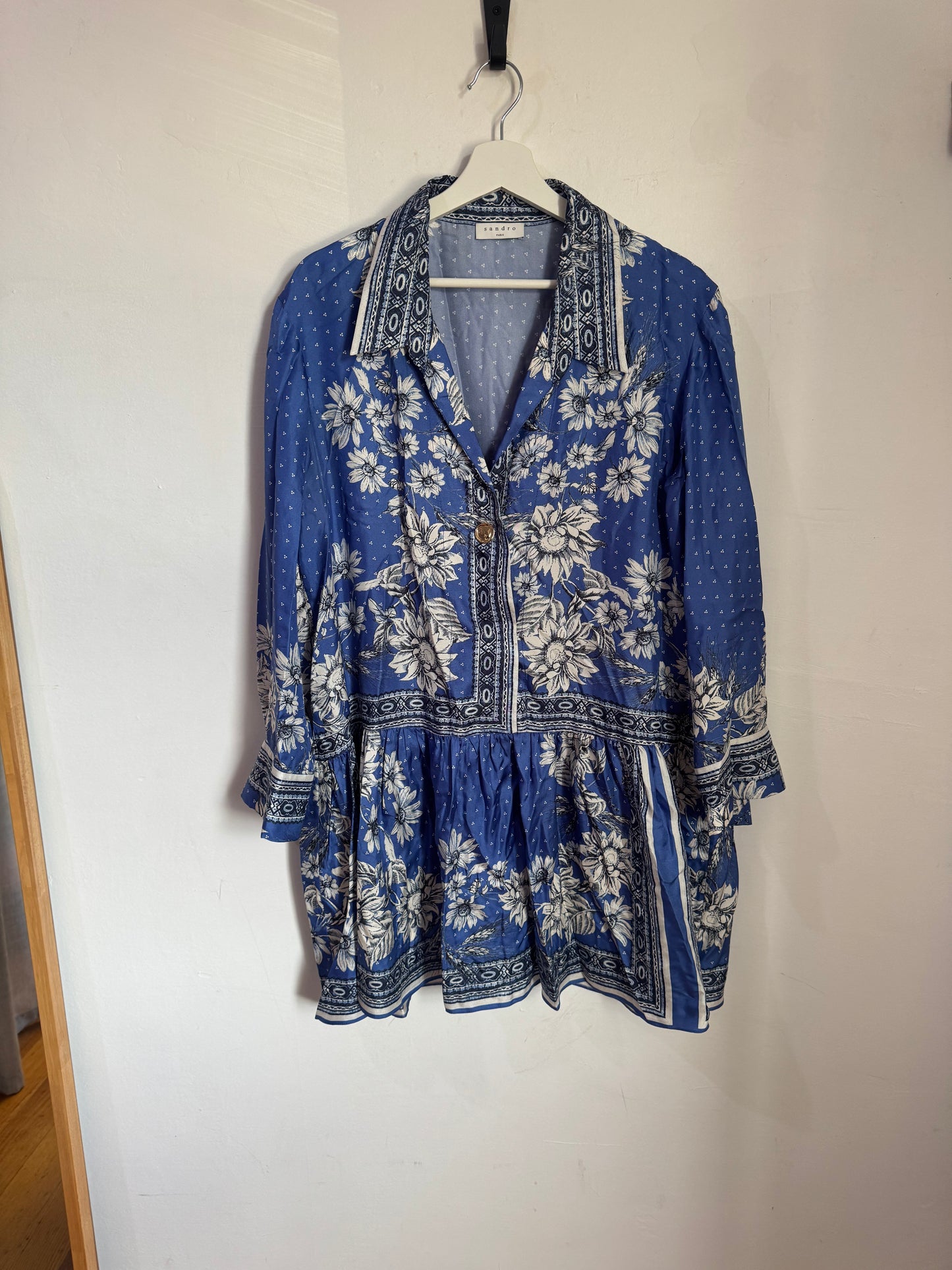 V-neck with shirt collar, long sleeves with cuffs, short flared skirt, mid-thigh length.