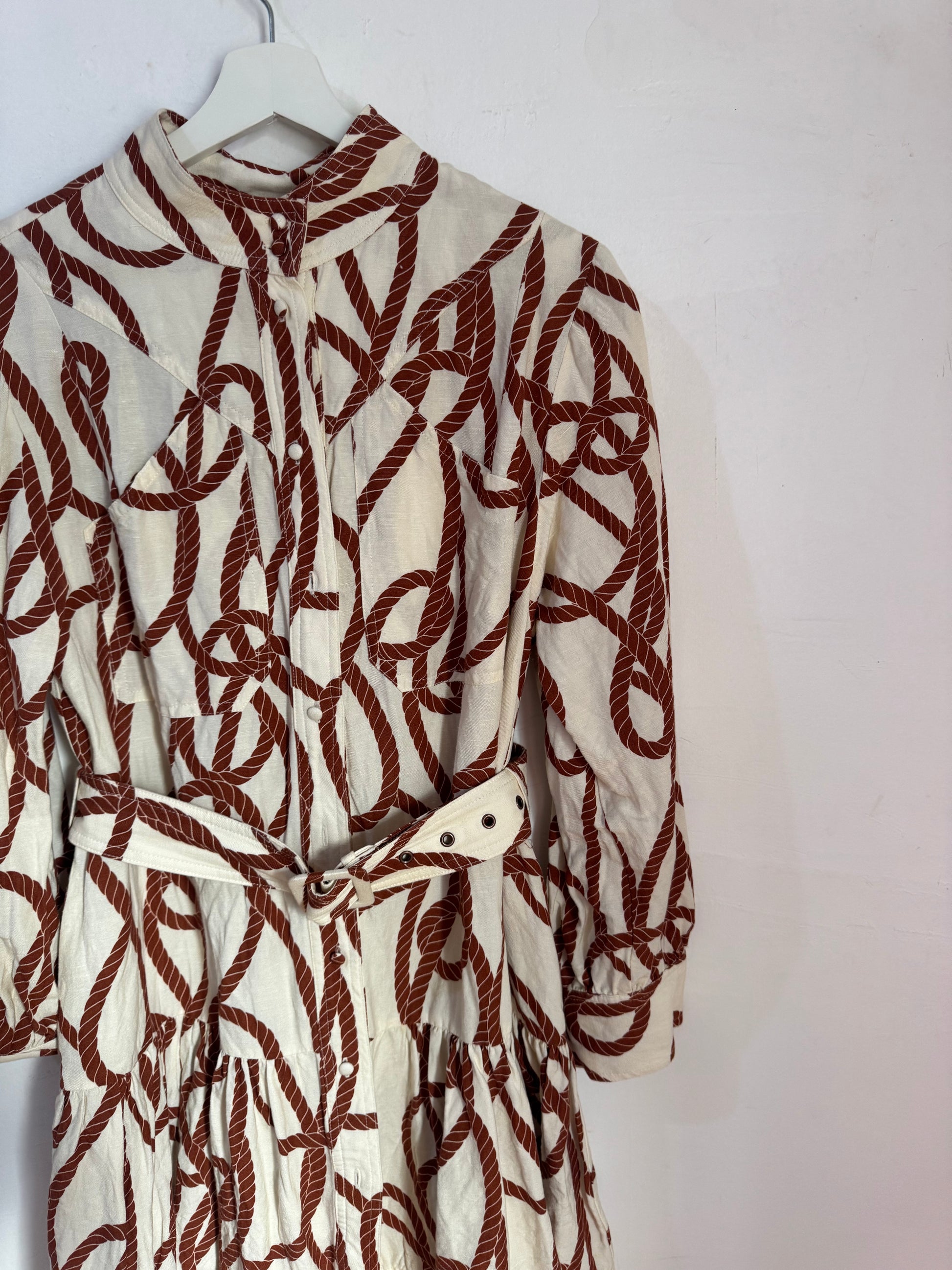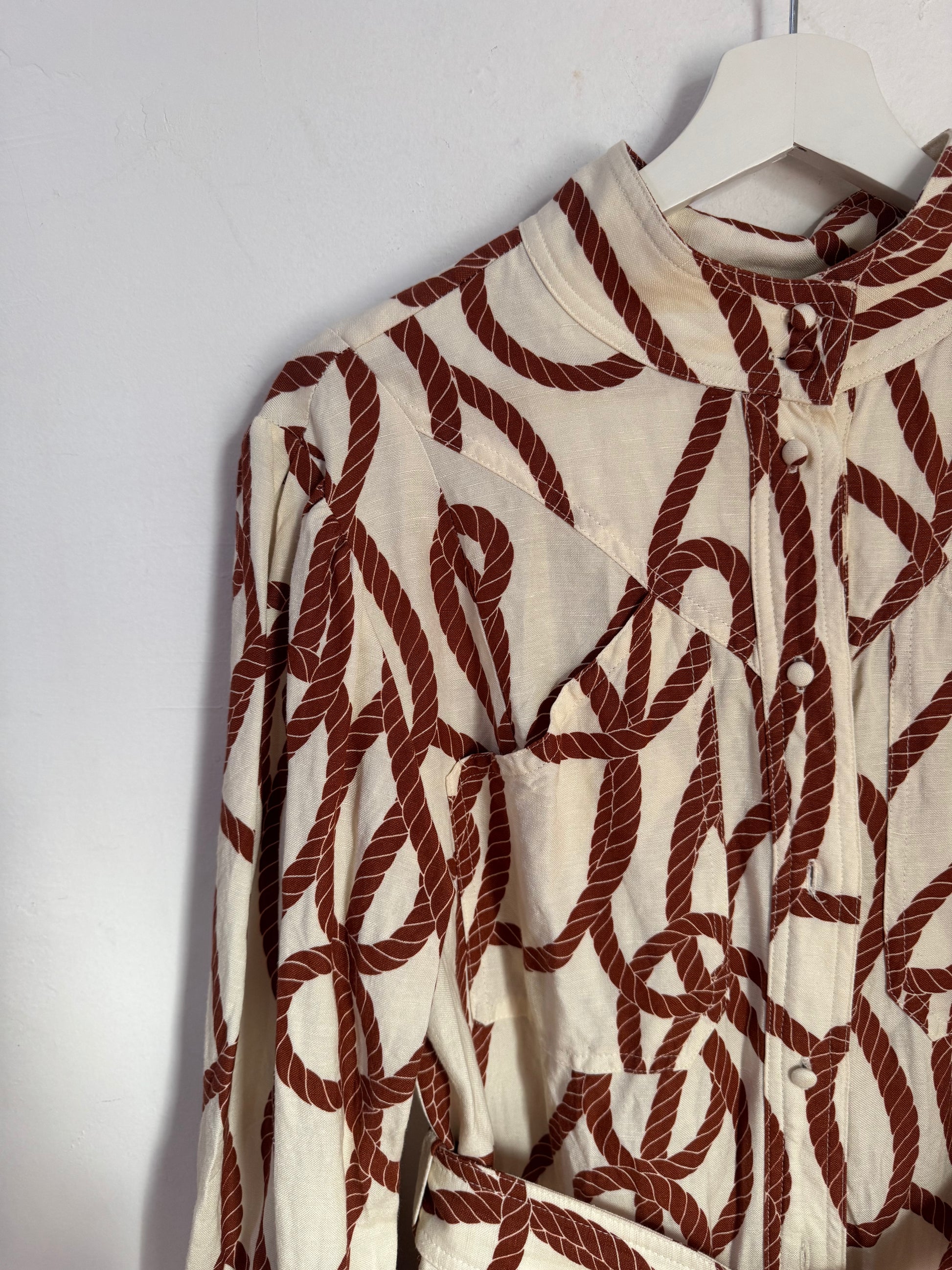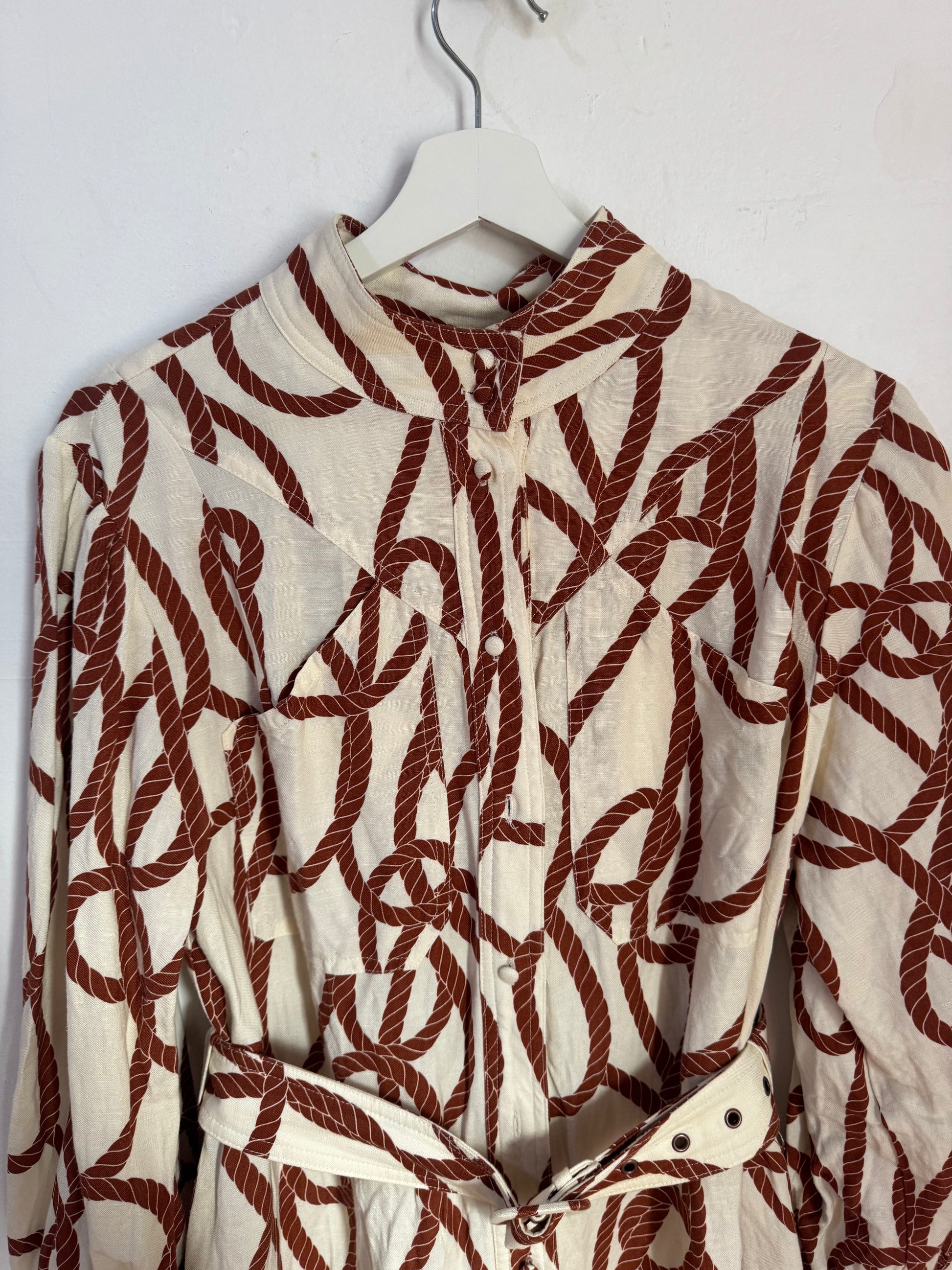 High neck utility mini dress with rope belt in the exclusive Mouillage print in a premium linen blend.