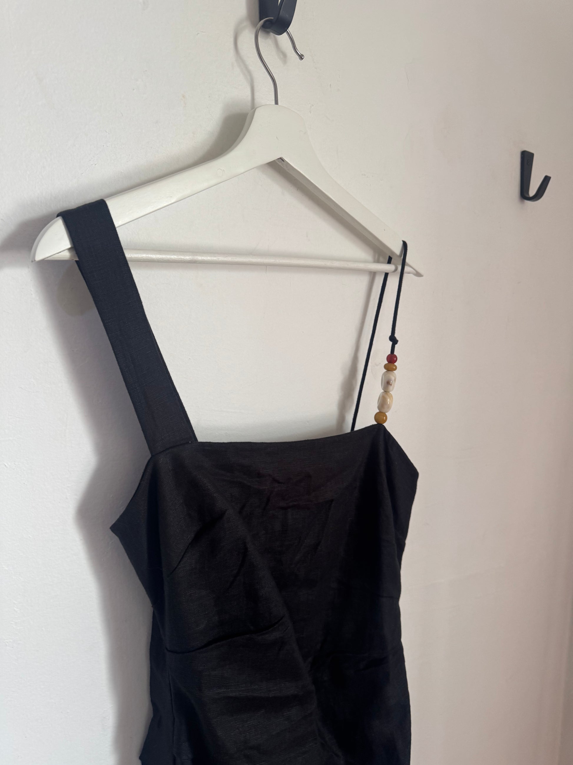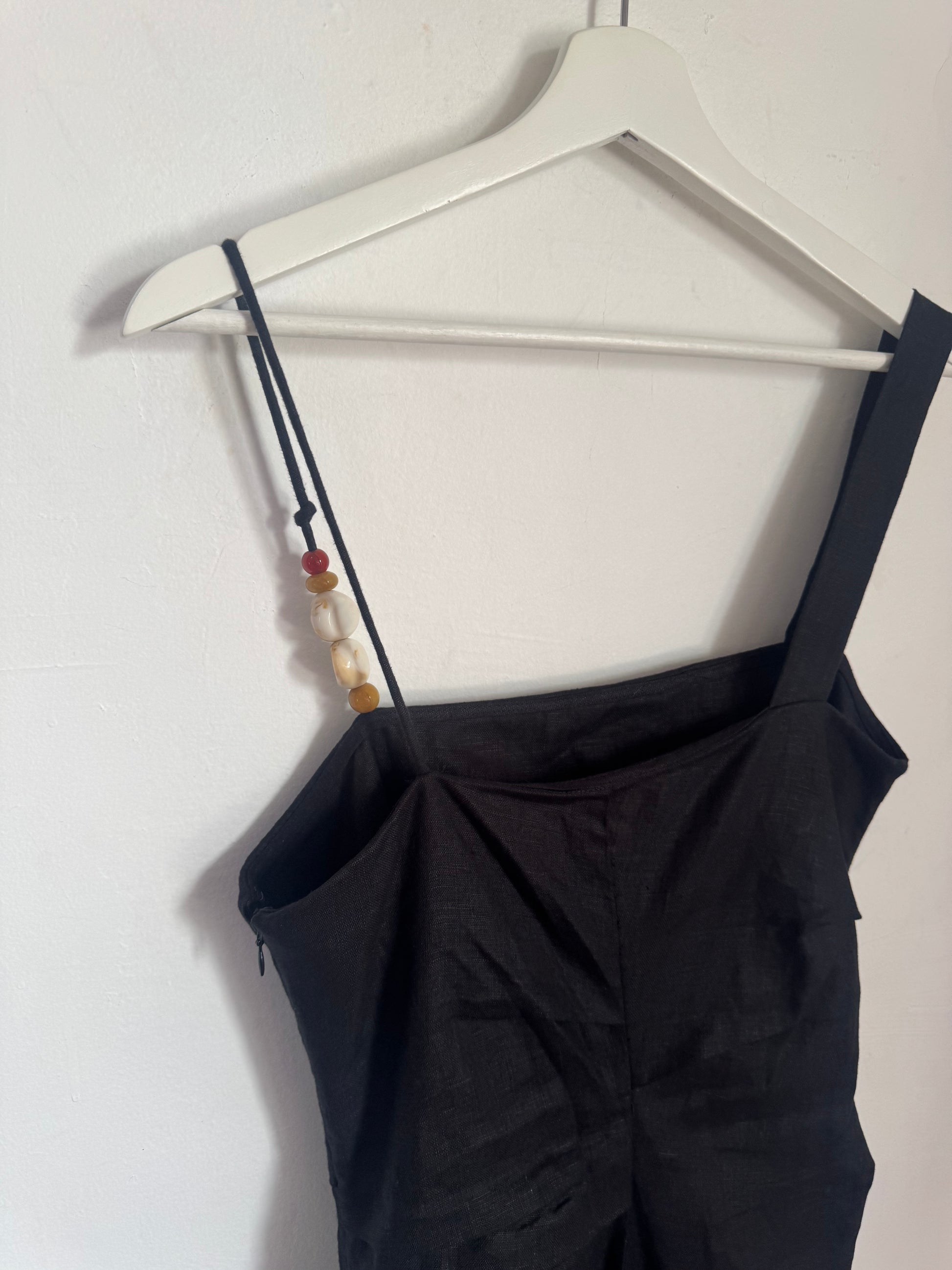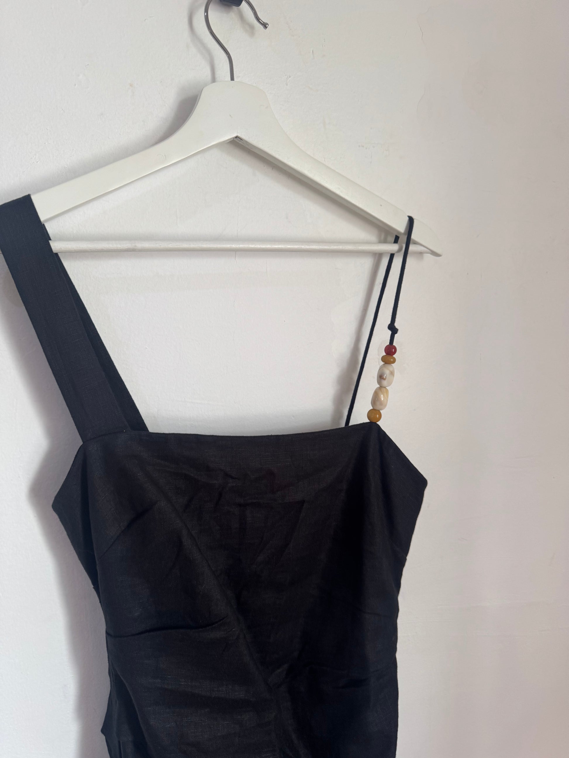 The Antonia Beaded Midi Dress in black is designed with asymmetric straps featuring stacked beads, a side split and tucks through the body, creating a flattering, feminine silhouette.
