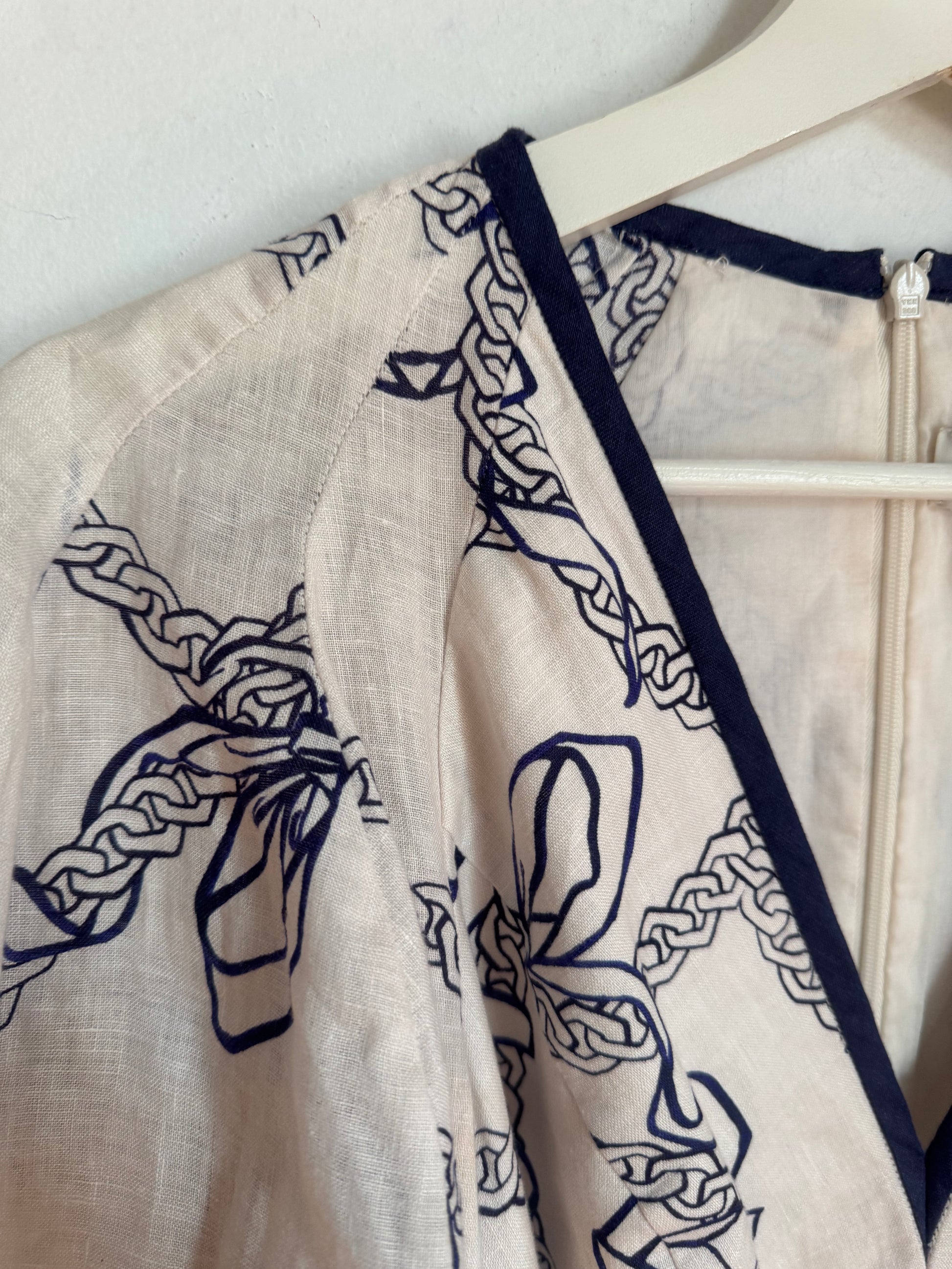 A linen midi dress featuring a contrast V-neckline, elbow length blouson sleeves with elasticated cuffs and a removable contrast neck tie.