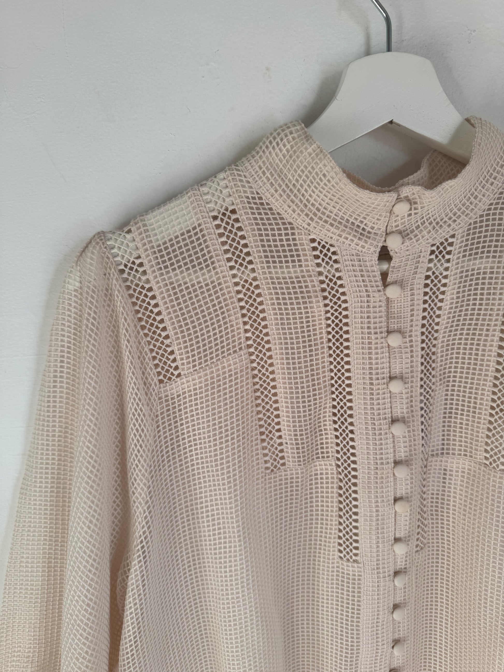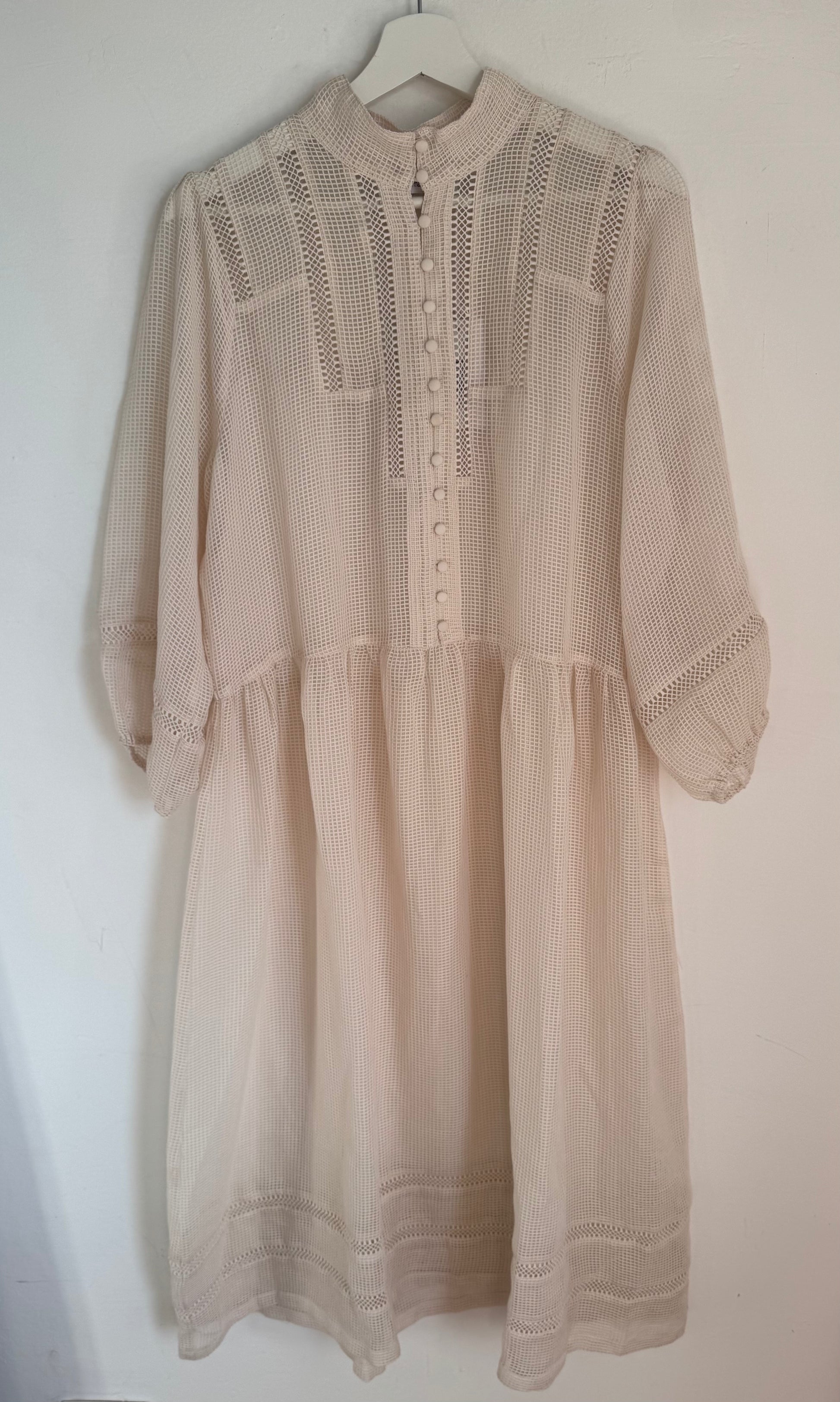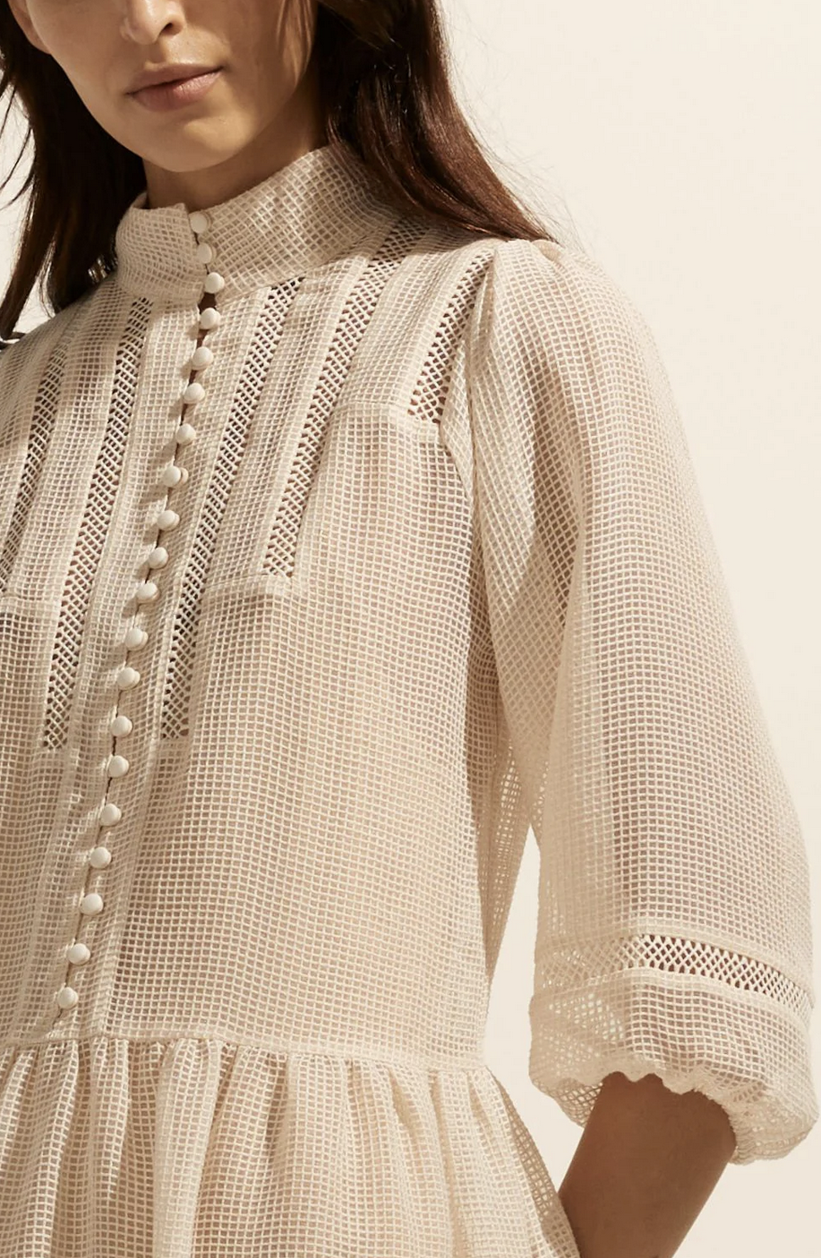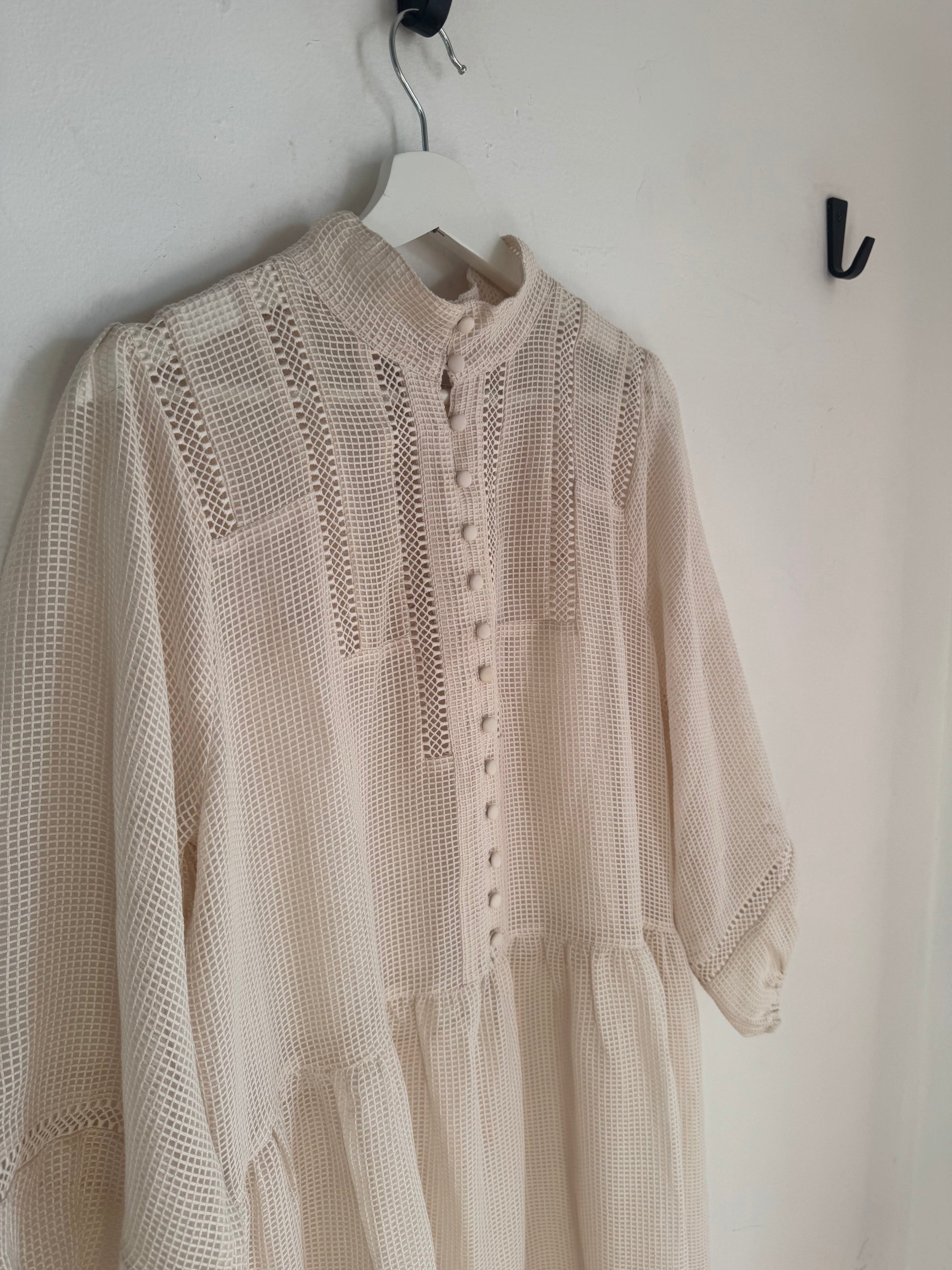 This romantic piece by Zoe Kratzmann is the ideal trans-seasonal dress. crafted in semi sheer window grid design this luxurious fabric offers lightness whilst remaining elevated. a high stand collar with covered buttons is punctuated by lace trim. See product details below.